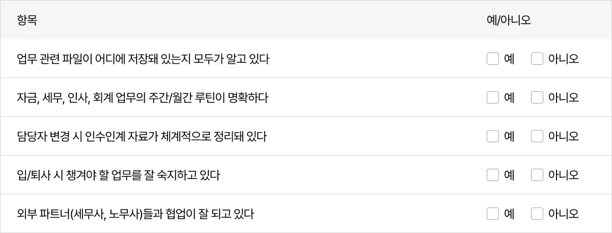 아래 항목 중 3개 이상 ‘아니오’ 표시가 있다면, 업무 연속성을 점검할 시점이에요.